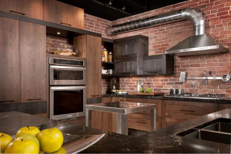 Цвет мебели в кухне лофт под тон кирпичных стен